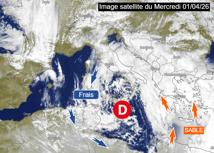 Avril commence de manière très agitée en Méditerranée. En effet, une dépression très active est centrée près de la Sicile au sud de l’Italie. Des vents puissants s’enroulent autour de celle-ci, rabattant un air très frais sur le Maghreb où la neige est parfois tombée en quantité à basse altitude ces dernières heures. Le sud de l’Italie subit des intempéries avec des précipitations très abondantes, provoquant des inondations et beaucoup de neige en montagne. À l’est de la dépression, d’importantes quantités de sable venu du Sahara remontent vers la Grèce.