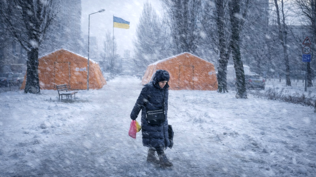 Alors que la guerre se poursuit, l’Ukraine fait face à un hiver très rigoureux. Le thermomètre chute jusqu’à -20°C à Kiev où les coupures d’électricité répétée empêchent les habitants de se chauffer et mettent la population à rude épreuve. Image améliorée par IA.