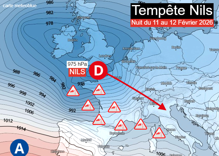 Associée à un vaste zone dépressionnaire, la tempête Nils se présentera sous la forme d’un minimum dépressionnaire qui se creusera au large de nos côtes atlantiques ce mercredi 11 février 2026. Ce dernier s’enfoncera en Manche durant la nuit du mercredi 11 au jeudi 12 février avec un cœur centré autour de 975 hPa. La dépression se décalera ensuite vers le nord de l’Italie. Les vents les plus forts frapperont d’abord l’arc atlantique avant de s’enfoncer sur le sud-ouest de la France puis le bassin méditerranéen.