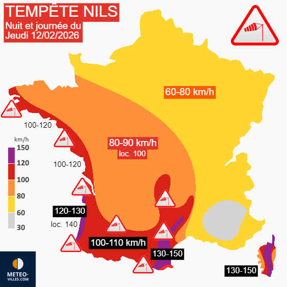 Rafales maximales générées par la tempête Nils en nuit et journée du jeudi 12 février 2026 – Météo Villes