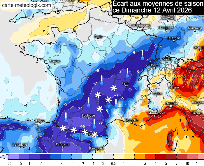 Écart des températures aux moyennes de saison ce dimanche 12 avril 2026 – meteologix.com