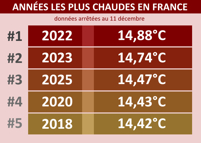 Si l’on ne prend en compte que la période allant du 1er janvier au 11 décembre, la température moyenne en France est de 14,47°C en 2025, se classant au troisième rang des plus chaudes, derrière les 14,74°C de 2023 et les 14,88°C de 2022. Ces deux années ayant connu une fin décembre remarquablement douce, il semble quasi-impossible que 2025 puisse les détrôner. Elle devrait se classer au troisième ou au quatrième rang des plus chaudes en France, rivalisant avec 2020 qui avait également connu une fin décembre très douce.