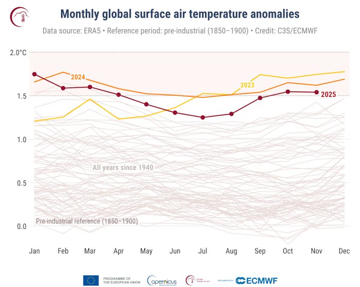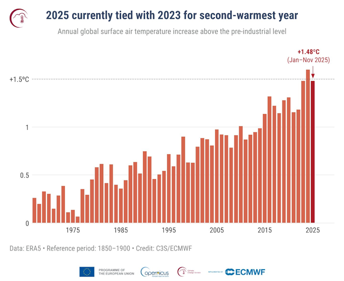 Sur la période allant de janvier à novembre 2025, l’anomalie thermique sur Terre atteint +1,48°C par rapport à l’ère pré-industrielle (1850-1900) ! Ce chiffre est très proche de l’objectif des accords de Paris sur le climat, adopté fin 2015, qui visaient à limiter le réchauffement à +1,5°C. Cette anomalie est semblable à celle enregistrée durant l’année 2023 mais reste derrière celle de 2024, qui était devenue la première année à dépasser la barre symbolique des +1,5°C avec une anomalie mondiale sur 12 mois de +1,55°C.