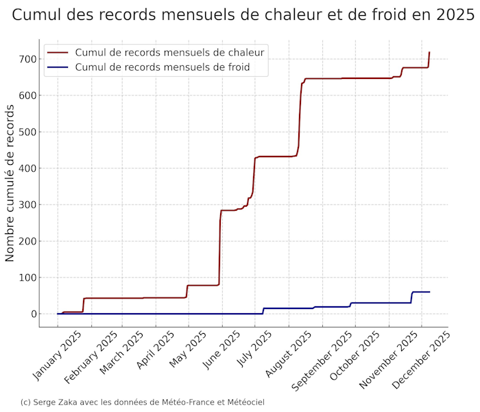 Records mensuels de chaleur (en rouge) et de froid (en bleu) battus au cours de l’année 2025 – via Serge Zaka
