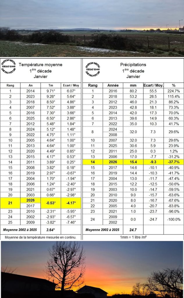le 11 janvier 2026 à 9:51 PM Les quelques traces de neige encore visible ce matin suite les giboulées d’hier soir n’ont pas fait long feu. Après 5h20 d’ensoleillement, le gel fait son retour ce soir, -1.4°, mais ne résistera pas au vent du Sud qui va se lever en seconde partie de nuit rapportant une certaine douceur la semaine prochaine. O, sera loin d’une beau coup de froid qui a marqué la première décade peu arrosée par ailleurs. Pour plus de détail : Températures décadaires 👉 https://www.meteo-viriat.fr/articles.php?lng=fr&pg=78&mnuid=779&tconfig=0#z2 Précipitations décadaires 👉 https://www.meteo-viriat.fr/articles.php?lng=fr&pg=66&mnuid=779&tconfig=0#z2