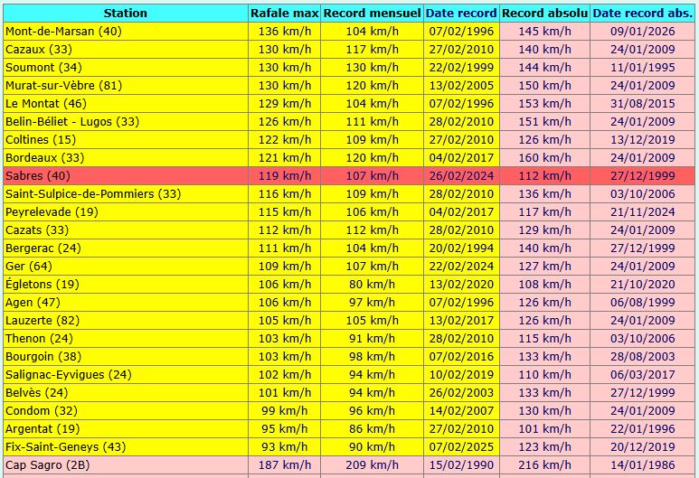 A noter également les 119km/h à la station secondaire de #Sabres (record absolu qui dépasse celui de 1999 !)