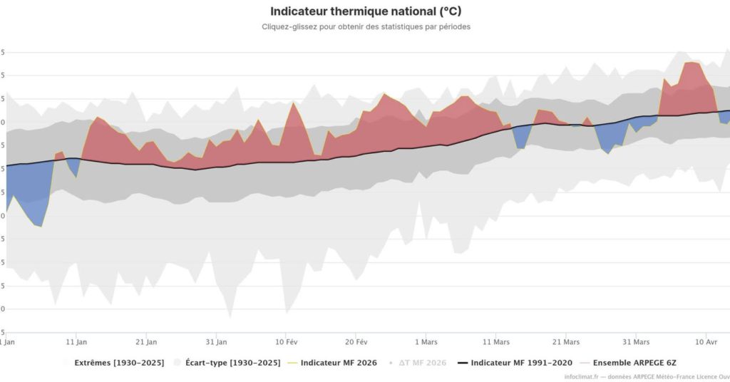 đDepuis le dĂ©but de l’annĂ©e, l’Indicateur Thermique National (ITN) affiche un excĂ©dent de +1,6°C ! La pĂ©riode de quelques jours dĂ©but janvier apparait comme la seule anomalie nĂ©gative vraiment prononcĂ©e (ainsi que dans une moindre mesure quelques jours fin mars). Le reste de ce dĂ©but d’annĂ©e a Ă©tĂ© marquĂ©e par une succession record de journĂ©es en excĂ©dent thermique !