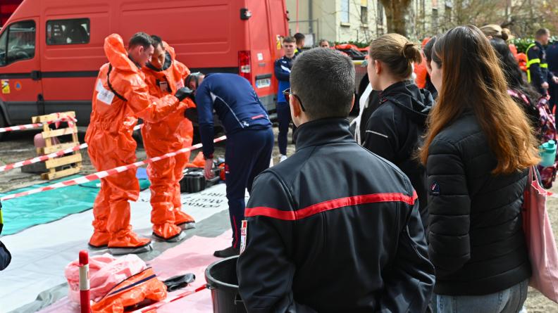 Décontamination NRBC-E : après une attaque simulée sur une centrale nucléaire, les participants ont mis en place une chaîne de décontamination, en lien avec des militaires disposant d’équipements spécialisés. Des étudiants en pharmacie ont analysé des substances chimiques inconnues afin de prendre en charge les patients contaminés.