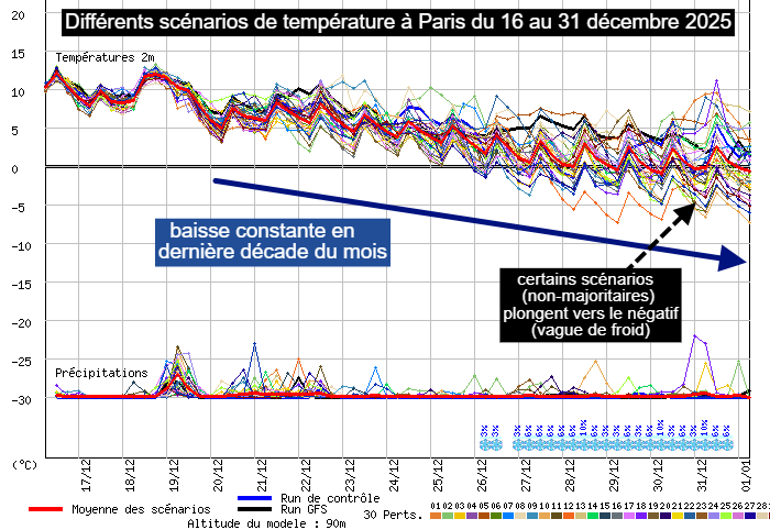 Différents scénarios de température à Paris du 16 au 31 décembre 2025 – meteociel.fr