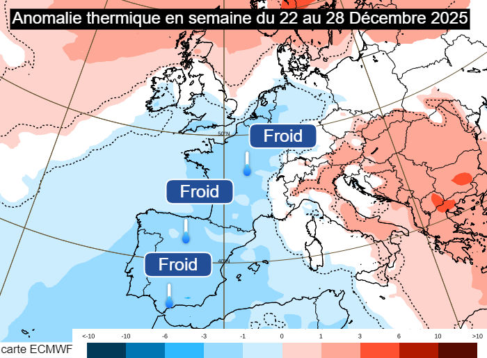 Anomalie thermique prévue en semaine du lundi 22 au dimanche 28 décembre 2025 – ECMWF