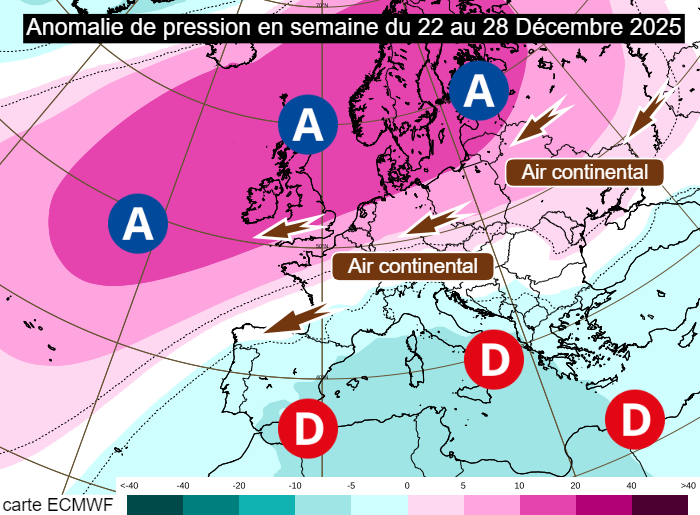 Anomalie de pression prévue en semaine du lundi 22 au dimanche 28 décembre 2025 – ECMWF