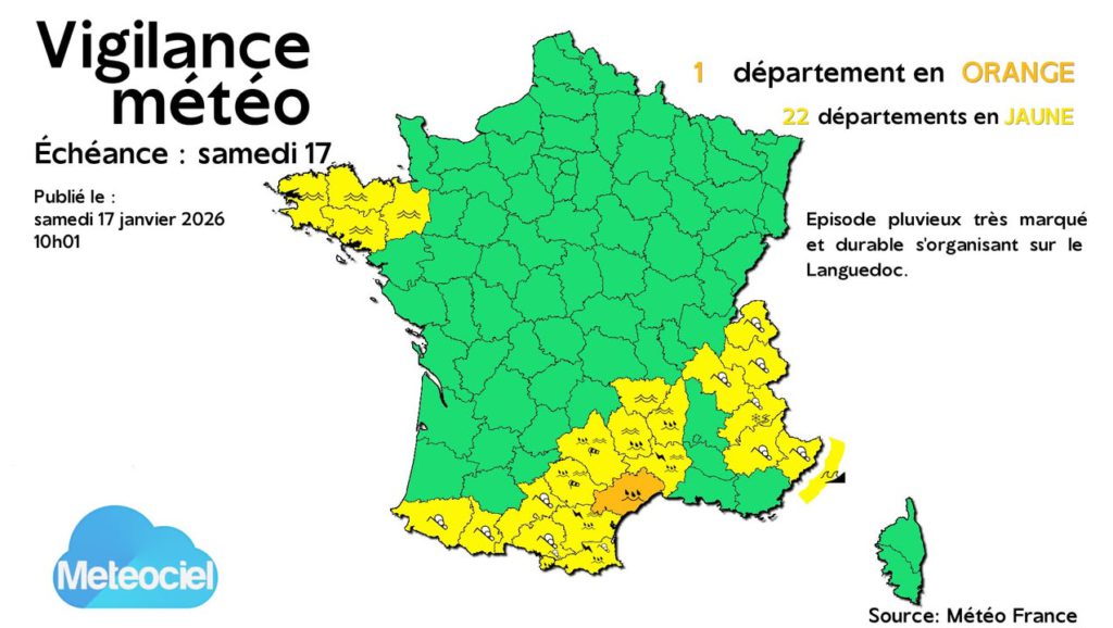 L’#Hérault est placé en #VigilanceOrange pluie-inondation à partir de ce soir 18h pour un épisode pluvieux durable sur le #Languedoc. Des cumuls de 100 à 150mm sont envisagés en 2 jours avec jusque 200mm sur les reliefs.