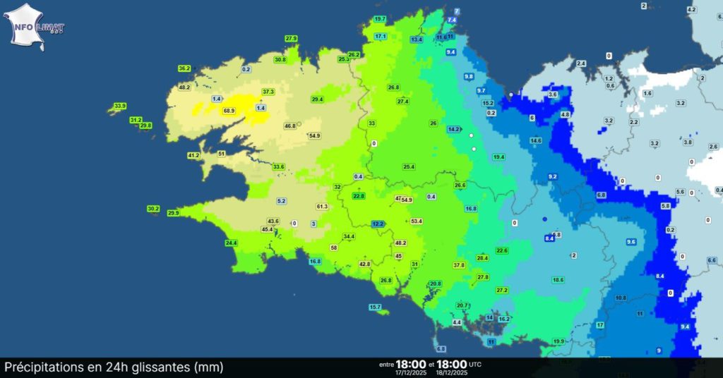 Un vaste système dépressionnaire situé entre Groenland et Islande guide une perturbation pluvieuse qui a abordé notre pays hier soir. Les pluies ont été copieuses en Bretagne sur ces dernières 24h, surtout dans sa partie Ouest, avec :