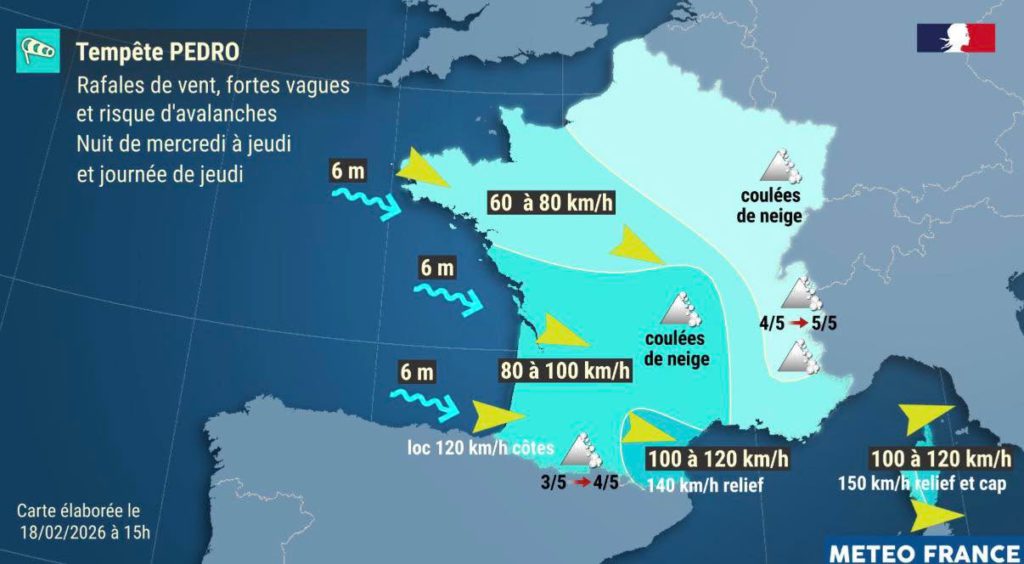 le 18 février 2026 à 3:29 PM ⚠️ Situation préoccupante en France. La tempête Pedro va concerner des zones déjà durement touchées. 💨 Rafales violentes dans le Sud 🌊 Mer très forte sur l’Atlantique 🌧️ Nouvelles pluies 🏔️ Risque important d’avalanches Grande vigilance. Suivez les bulletins météo sur BFMTV.