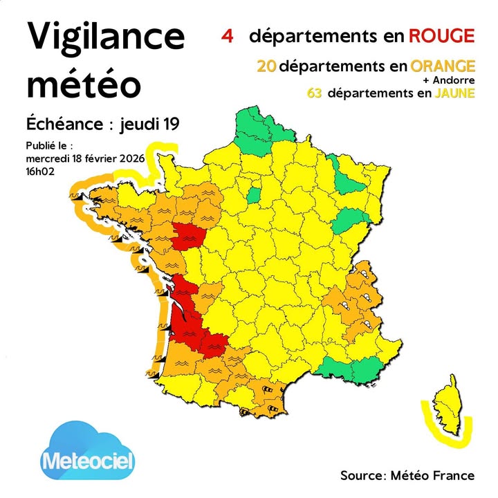 A l’arrière de la dépression, un régime de traîne active se mettra en place avec un coefficient de marée de 96 jeudi matin pourra générer des submersions, toute la façade atlantique est en vigilance orange 🟠 entre 3h et 9h.