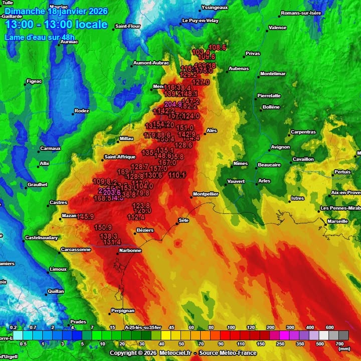 L’épisode pluvieux perdure avec des cumuls dépassant les 200 mm en 48h et de vastes zones > 100mm jusqu’en plaine.
