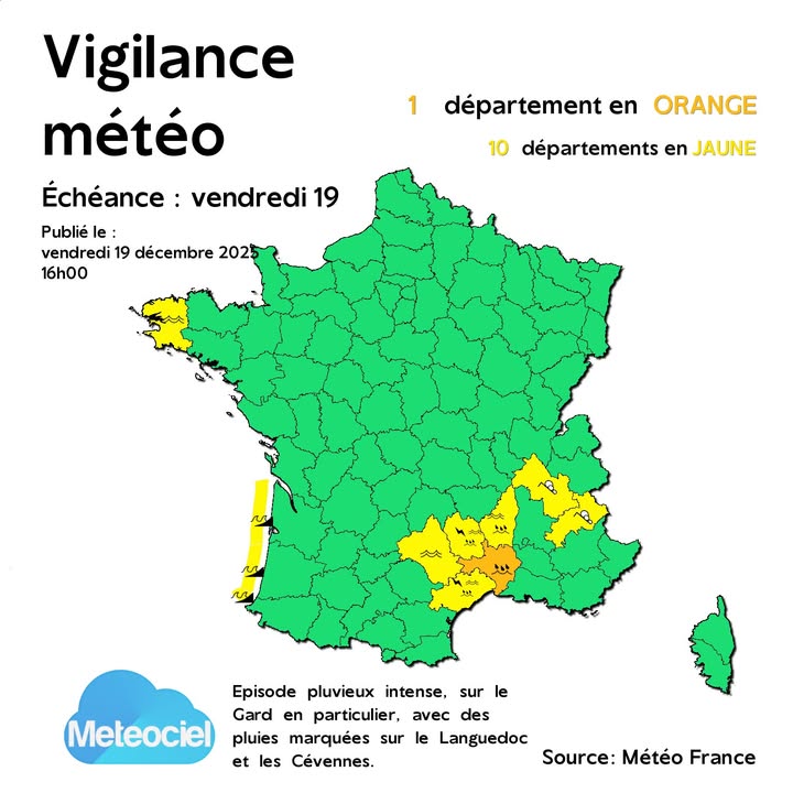 Le #Gard est placé en #VigilanceOrange pour #pluie/#inondation. Un épisode pluvieux intense est en cours sur le #Languedoc et les #Cévennes. Des cumuls de +200mm sont possibles localement sur les reliefs jusqu’à Dimanche.