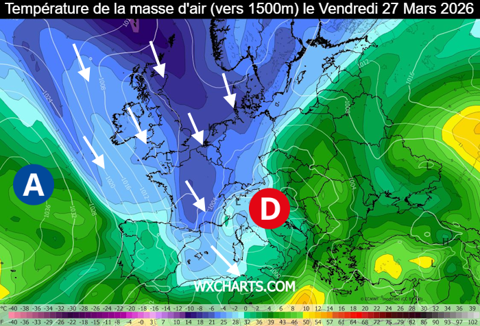 Température de la masse d’air vers 1500m prévue le vendredi 27 mars 2026 – wxcharts.com