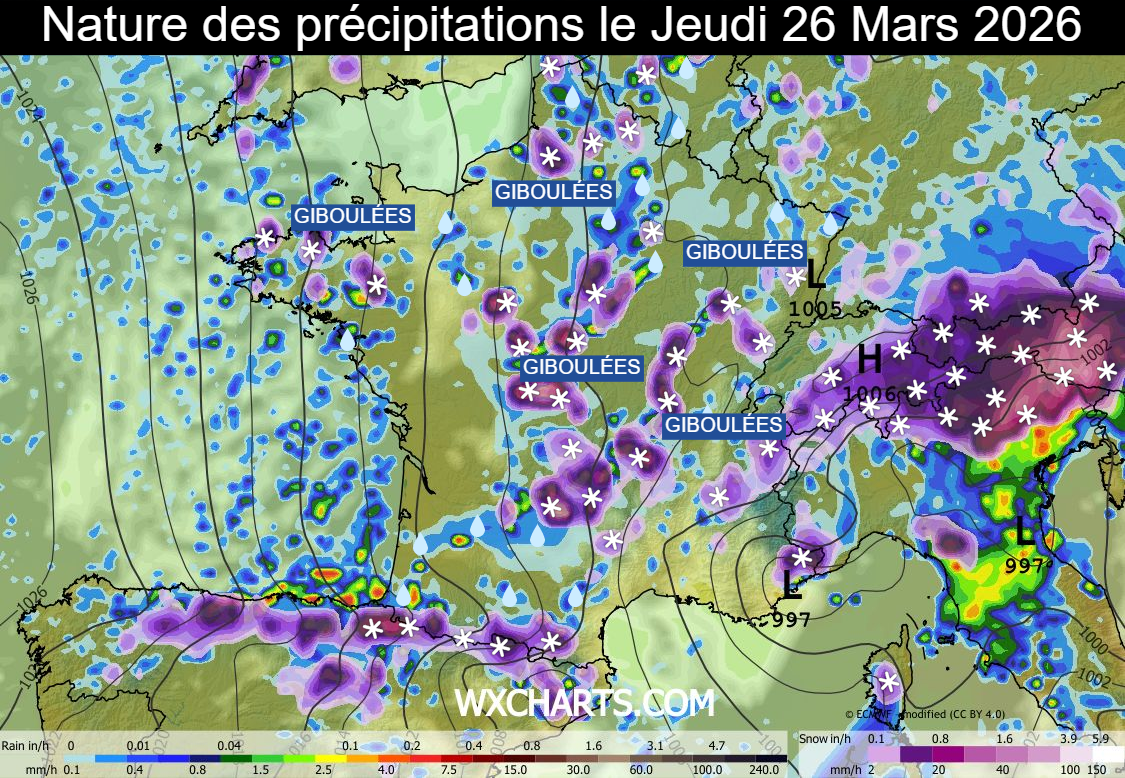Nature des précipitations le jeudi 26 mars 2026 selon le modèle européen – wxcharts.com