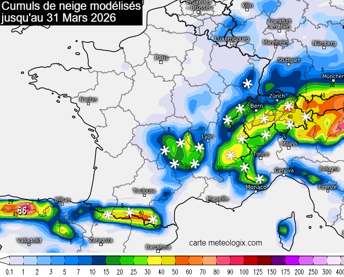 Cumuls de neige modélisés jusqu’au 31 mars 2026 – meteologix.com
