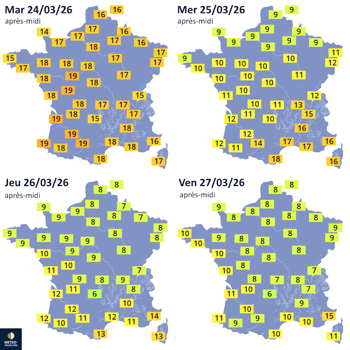 Températures maximales prévues du mardi 24 au vendredi 27 mars 2026 – Météo Villes