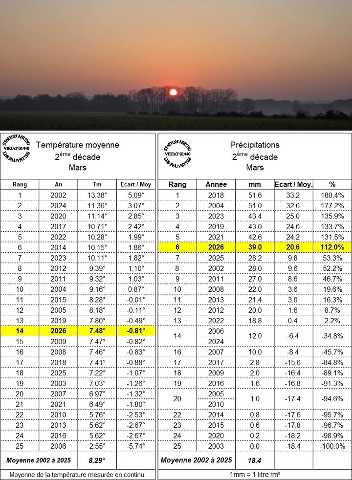 le 21 mars 2026 à 6:56 AM La seconde décade a été légèrement moins douce et plus arrosée que la normale. Tout l’inverse de la première qui est la plus douce de l’historique avec une température moyenne de 10.9°! et seulement 3mm. Pour une analyse plus détaillée : Températures décadaires 👉 https://www.meteo-viriat.fr/articles.php?lng=fr&pg=91&mnuid=779&tconfig=0#z2 Précipitations décadaires 👉 https://www.meteo-viriat.fr/articles.php?lng=fr&pg=80&mnuid=779&tconfig=0#z2 Avec une mini de 0.4° on échappe de peu à la gelée sous abri ce matin mais pas à la gelée blanche sur les toitures et parebrises. La journée s’annonce ensoleillée comme hier et la décade est prévue moins douce que la normale en l’état actuel des modèles.