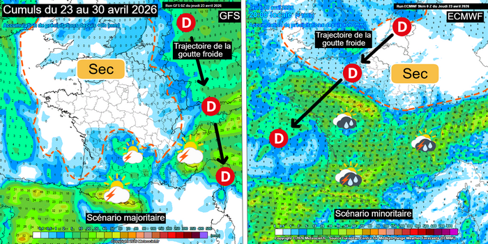 Comparaison des cumuls de précipitations prévus jusqu’à 30 avril 2026 sur la France – via meteociel