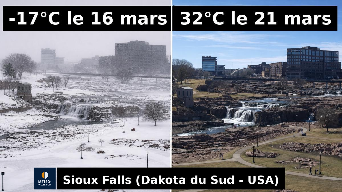 La ville de Sioux Falls citée précédemment est ainsi passée d’une température minimale record de -17.2°C le 16 mars à une chaleur exceptionnelle pour un mois de mars seulement 5 jours plus tard. On a en effet pu relever jusqu’à 31.7°C ce samedi 21 mars sur cette station, la température la plus élevée jamais relevée au mois de mars sur ce secteur !