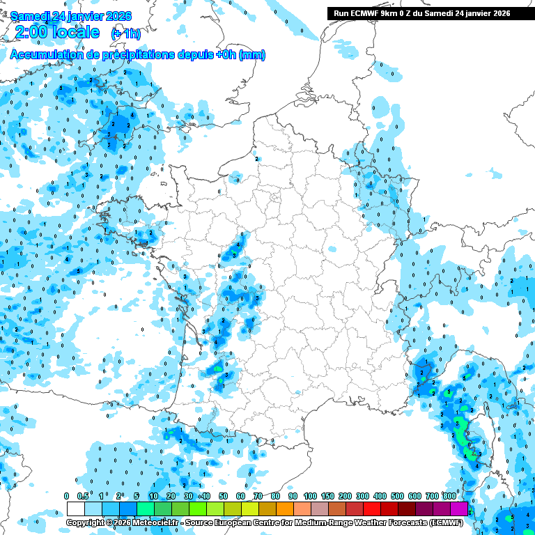 Cumuls de pluie prévus d’ici le 8 février (modèle météo européen)