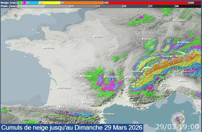 Cumuls de neige modélisés jusqu’au dimanche 29 mars 2026 – skipass.com