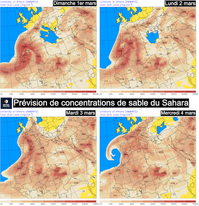 Prévisions des remontées de sable du Sahara entre le 1er et le 4 mars – météo grecque (université d’Athènes)