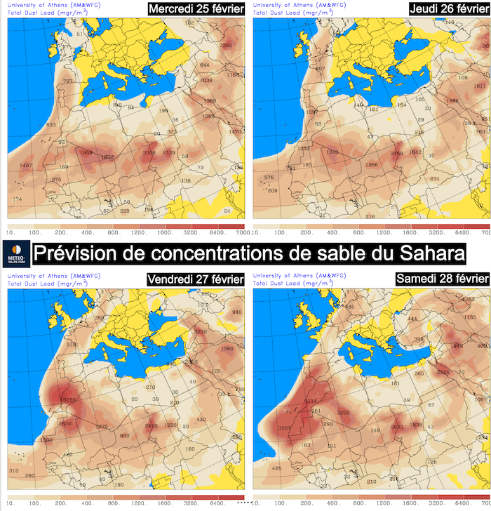 Prévisions des remontées de sable du Sahara d’ici samedi 28 février – météo grecque (université d’Athènes)