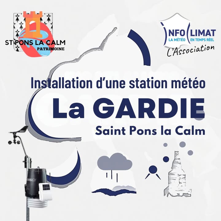 le 25 janvier 2026 à 9:22 PM Nouvelle station de l’Association Infoclimat désormais en ligne sur la commune de Saint-Pons-la-Calm (Gard): https://www.infoclimat.fr/observations-meteo/temps-reel/saint-pons-la-calm-la-gardie/STATIC0451.html Située en secteur Rhodanien, sur une tour d’observation au sommet de la colline de La Gardie (290m), elle sera particulièrement exposée aux fortes rafales de vent notamment en période de mistral. Un très grand merci à la commune de Saint-Pons, et notamment à l’Association Saint Pons Patrimoine – ASPP, à la fois pour la mise à disposition de l’emplacement, pour leur accompagnement et surtout pour leur persévérance ayant permis cette installation après de nombreuses péripéties techniques ! Vous appréciez nos stations et nos publications soutenez nous en adhérant à l’association en 2026 !🌦️ Nouveauté à Saint Pons la Calm ! 🌡️ Nous sommes ravis de vous annoncer l’installation d’une station météo en temps réel en haut de La Gardie ! Grâce à ce nouvel équipement, vous pourrez désormais suivre les conditions météorologiques locales avec précision : température, humidité, vitesse du vent, précipitations, et bien plus encore. Cette initiative, menée en partenariat avec Infoclimat, la commune de Saint Pons la Calm et l’association du patrimoine vise à offrir des données fiables pour les habitants, les agriculteurs, les randonneurs et tous les passionnés de météo. 📍 Où la trouver ? En haut de La Gardie, un lieu emblématique de notre patrimoine local. 🌐 Comment suivre les données ? https://www.infoclimat.fr/observations-meteo/temps-reel/saint-pons-la-calm-la-gardie/STATIC0451.html?graphiques&units!degres=degF#! Un grand merci à tous ceux qui ont contribué à ce projet, et à très vite pour le lancement officiel ! #météo #saintponslacalm #lagardie #infoclimat #ASPP