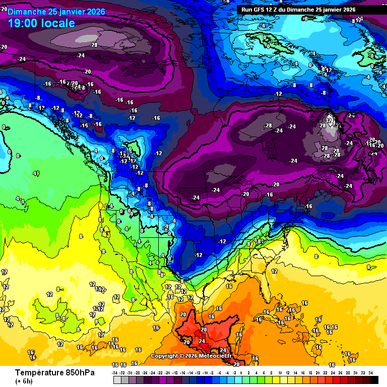 Evolution des températures à 850 hPa sur l’Amérique du Nord du 26 au 31 janvie r2026 – via meteociel