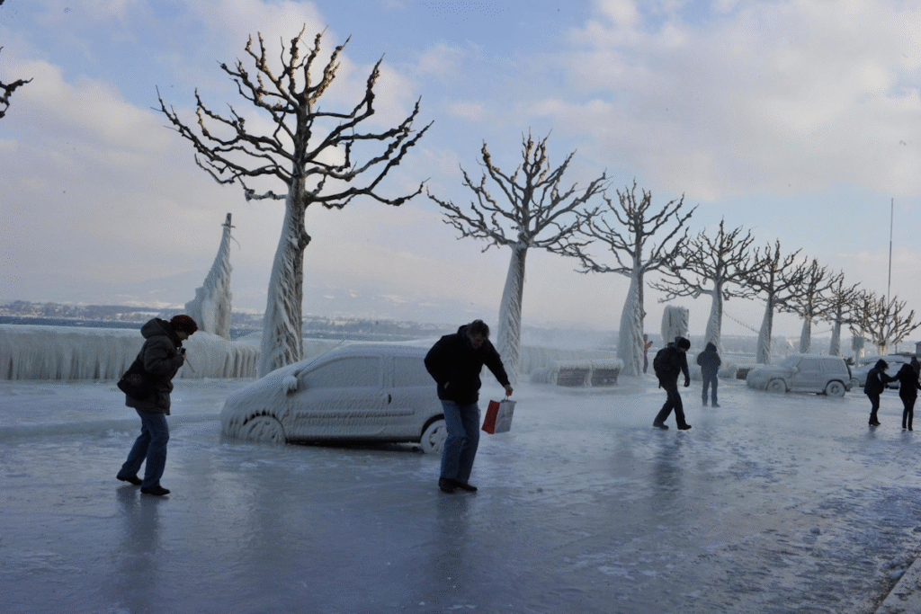 En réalité, cela fait plus de 7 ans que la France n’a plus vécu de « vague de froid » au sens strict du terme. Le dernier épisode date de fin février 2018. Du 26 au 28 février 2018, l’indicateur thermique était resté dans le négatif avec un pic à -3,2°C le 27. Les deux tiers nord et est de la France avaient connu 2 à 3 journées sans dégel, y compris Paris. La nuit la plus froide fut celle du 27 au 28 février avec des minimales descendant fréquemment sous les -10°C dans le centre et l’est de l’hexagone (-14°C à Luxeuil, Saint-Étienne et Aurillac). La bise était venue accentuer la sensation de froid avec des ressentis parfois proches de -10 en plein jour ! Certains secteurs bordant le Lac Léman ont été recouverts de glace sous les embruns poussés par la bise, comme l’illustre la photo ci-dessous.