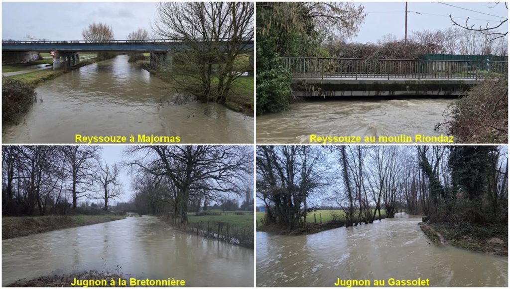 le 28 janvier 2026 à 9:13 PM Les 2 modèles de Météofrance ont été performants dans leurs prévisions puisque 43.8mm de pluie sont tombés depuis hier midi vs 41.1mm prévus par AROME et 41.7mm par ARPEGE alors que l’Allemand ICON D2 prévoyait 24.9mm🤔 Alors que le cumul mensuel accusait un déficit de 30mm au 21, 7 jours plus tard janvier présente un excédent de 21mm avec 91.8mm vs 70.8mm de normale au 28. Les 77mm de moyenne mensuelle sont déjà dépassés! Quant au cumul des précipitations depuis le 1er décembre, le déficit s’est nettement réduit passant de 61.7mm au 21/01 à 10.6mm ce soir👌 L’épisode n’est pas passé inaperçu avec une réaction importante des 2 principaux cours d’eau qui traversent la comme dont les niveau ont considérablement augmenté en 36h : Celui de la Reyssouze à Majornas est passé de 35 à 95cm Celui du Jugnon de 19cm à 116cm à la station de mesure de Reyssouze et Affluents à la Bretonnière. Demain accalmie, vendredi retour de la pluie bien plus modérée. Cumuls de l’épisode des 6 autres stations Davis Pro dans un rayon de 10km : 37.8mm à Météo Bourg en Bresse – Ain 01 41.6mm à St Etienne du Bois 55.6mm à St Just 39mm à Météo Buellas – Ain 01 40mm à Jasseron 43.8mm à EtrezPhotos de la publication de Météo-Viriat