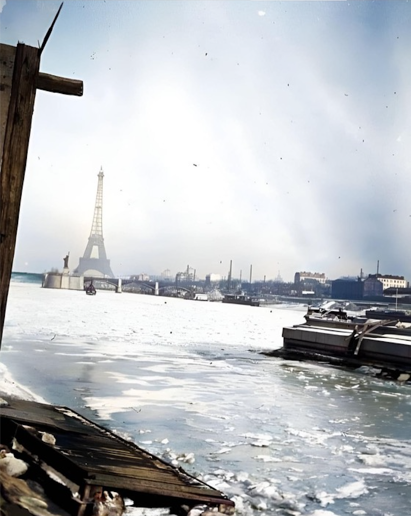 En janvier 1917, en pleine Première Guerre mondiale, plusieurs photos montrent la Seine gelée aux abords de Paris et jusque dans le centre, près du pont Saint-Michel. On y voit des plaques épaisses s’entrechoquer, des péniches bloquées et une brume glacée sur la ville.