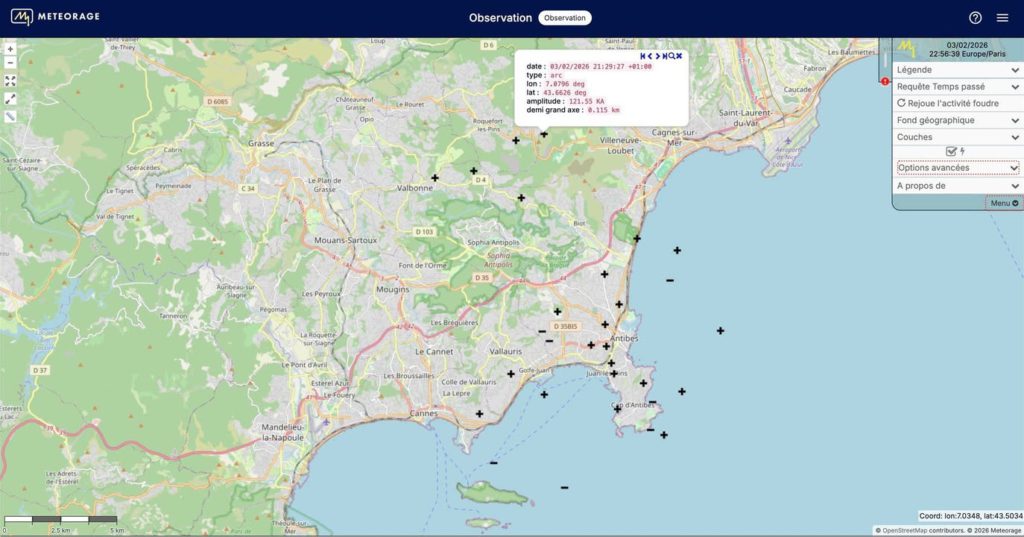 ⚡ Côté activité électrique, un impact de foudre très puissant (121 kA) a été mesuré sur les hauteurs de Villeneuve-Loubet. Merci Meteorage
