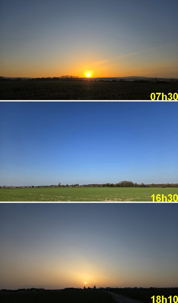 Malgré la progression des poussières de sable, parfaitement visibles au coucher du soleil, celui-ci n’a pas eu de mal à faire monter très haut la température : 19.3° vs 11.3° de normale. Et pourtant avec 1.5° la minimale était de saison : 1.3° de normale.