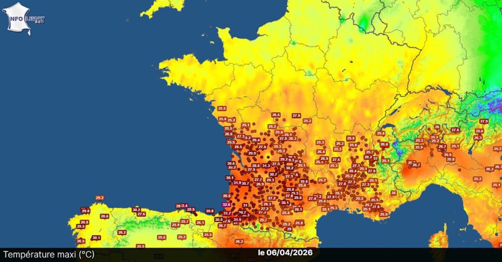 le 6 avril 2026 à 5:13 PM 🌡Des températures remarquables pour un début avril ! Cet après-midi, les valeurs ont atteint des valeurs dignes d’un plein été sur la moitié sud. Le seuil des 30°C a été atteint de la Gironde aux Pyrénées-Orientales ainsi qu’entre Dordogne et Lot. Nous relevons : 31,9°C à Belin-Beliet (33) 31,8°C à Léon (40) 31,5°C à Trois-Villes (64) 31,4°C à Queyssac (24) 30,3°C à Cahors (46) La moitié Nord relevait presque 20°C de moins par endroits avec 11,7°C au Cap Gris-Nez (62) et 12,2°C à Saint-Vaast-la-Hougue (50)Photos de la publication de Infoclimat