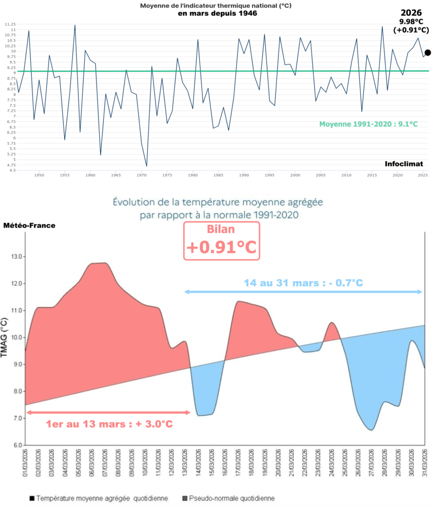 Moyenne de l’indicateur thermique national en mars depuis 1946 & Indicateur thermique quotidien en mars 2026 – Infoclimat & Météo-France