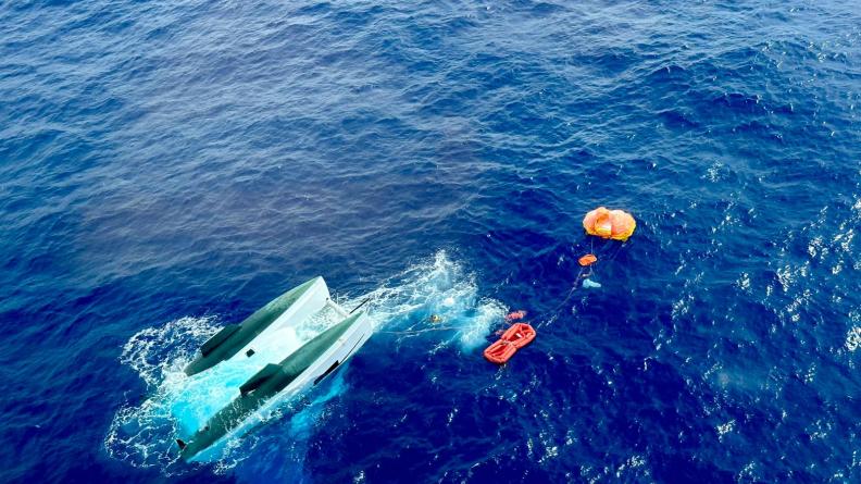 Après avoir localisé le catamaran retourné, le Falcon 50 a largué une chaîne SAR (Search and Rescue), comprenant un radeau de survie, des vivres, de l’eau et des équipements de sécurité, afin de sécuriser les naufragés en attendant l’arrivée d’un navire de commerce, dérouté par le JRCC à plus de 13 heures de navigation.