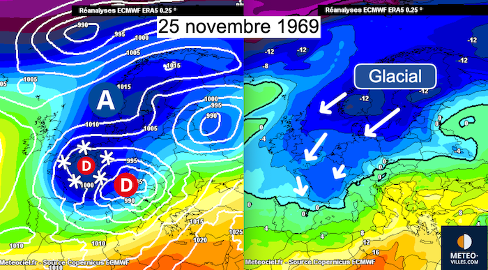 Après les chutes de neige conséquentes et étendues des 25 et 26 novembre 1969, les températures nocturnes descendent à –10 °C à Saint-Étienne, –8 à -10°C dans les zones peu urbanisées de l’Ile-de-France et surtout –29,6 °C à Mouthe, valeur qui constitue encore aujourd’hui le record absolu national pour un mois de novembre ! La commune du Jura confirme alors sa réputation de « petite Sibérie » française, liée à sa topographie de cuvette favorisant l’emprisonnement d’air froid.
