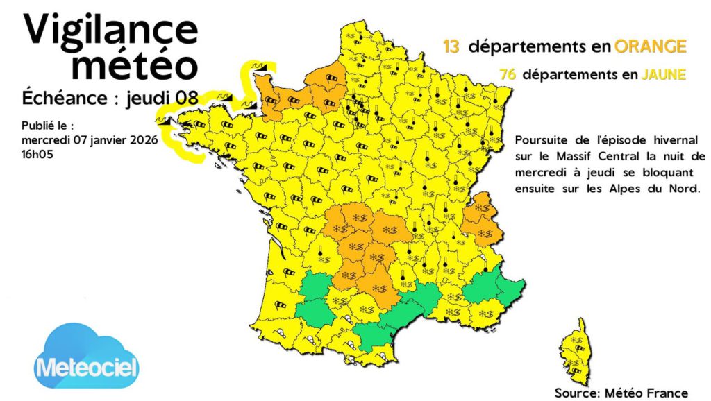 13 départements seront placés en #VigilanceOrange demain jeudi. 4 en #Normandie pour les fortes rafales de vent liées à la tempête Goretti, et 9 pour neige/verglas pour la suite de l’épisode hivernal sur le #MassifCentral et les #AlpesDuNord.