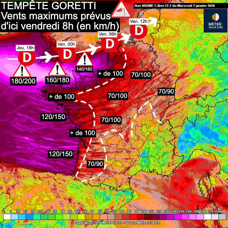 Rafales de vent maximales prévues par le modèle français ARÔME d’ici vendredi 8h du matin