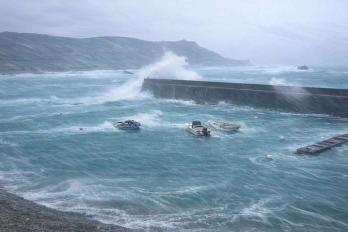 Simulation du port de Goury (près de la Hague, dans le Cotentin) au pire moment de la tempête avec des vents probablement autour de 170 à 180 km/h en rafales