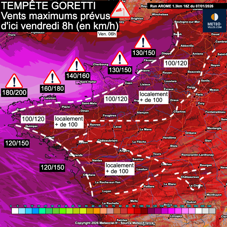 Par conséquent, Météo-France a placé le nord-ouest de la France en vigilance orange tempête et le département de la Manche en vigilance rouge pour la soirée du jeudi 8 janvier 2026 et la nuit suivante.