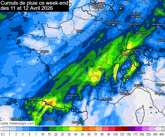 Cumuls de pluie modélisés ce week-end des samedi 11 et dimanche 12 avril 2026 – meteologix.com
