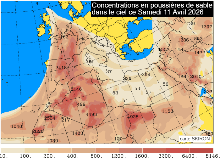 Concentrations en poussières de sable dans l’atmosphère le samedi 11 avril 2026 – SKIRON