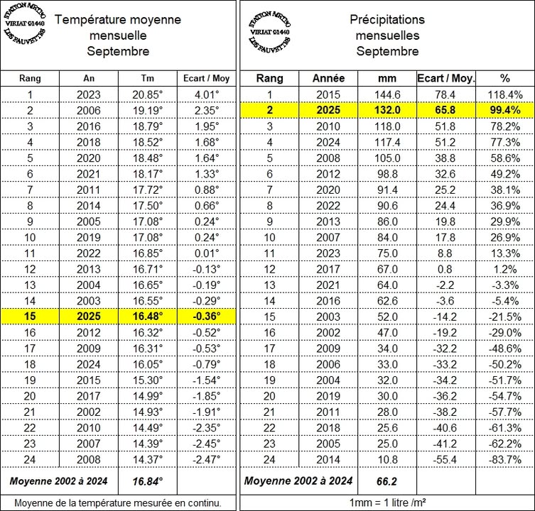 Septembre dans sa globalité a été un peu moins doux et copieusement arrosé, retrouvé tous les détails dans l’analyse climatologique sur le site où en la téléchargeant ici 👉https://www.meteo-viriat.fr/file/SYNTHESE%20SEPTEMBRE%202025.pdf